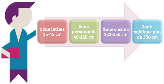Les gestes servent surtout à éloigner ou à rapprocher les personnes qui nous écoutent. Un geste peut être, par exemple, faire un pas en arrière. La proxémique -partie de la sémiotique dédiée à l’étude de l’organisation de l’espace dans la communication linguistique- nous dit que l’on a tendance à gérer quatre types d’espaces en fonction de la confiance que nous avons dans les personnes avec qui nous communiquons. Les voici dans le schéma suivant :