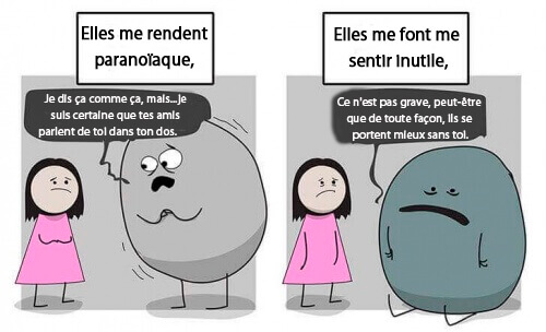C’est vrai que quand ces passager-ère-s, ces pensées et ces sentiments très négatifs apparaissent, iels semblent pouvoir nous faire beaucoup de mal. Et c’est pour ça que vous acceptez ce traitement et que vous faites ce qu’iels disent pour qu’iels vous laissent tranquille et qu’iels descendent enfin du bus, pour que ne plus les voir.